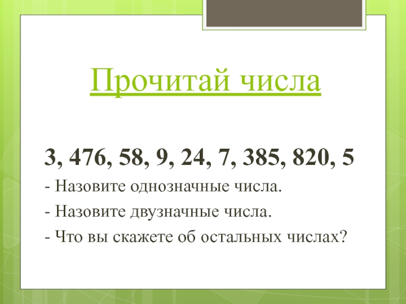 Прочитай числа 3, 476, 58, 9, 24, 7, 385, 820, 5- Назовите однозначные числа.- Назовите двузначные числа.- Что вы скажете об остальных числах?
