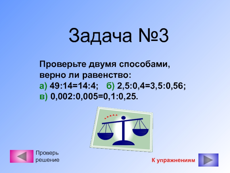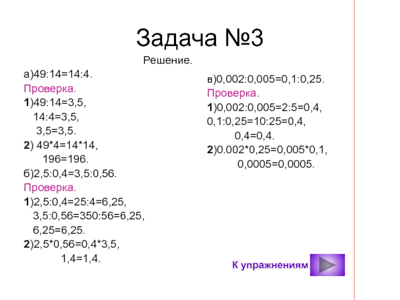 Задача №3Решение.а)49:14=14:4.Проверка.1)49:14=3,5,  14:4=3,5,  3,5=3,5.2) 49*4=14*14,   196=196.б)2,5:0,4=3,5:0,56.Проверка.1)2,5:0,4=25:4=6,25,  3,5:0,56=350:56=6,25,  6,25=6,25.2)2,5*0,56=0,4*3,5,