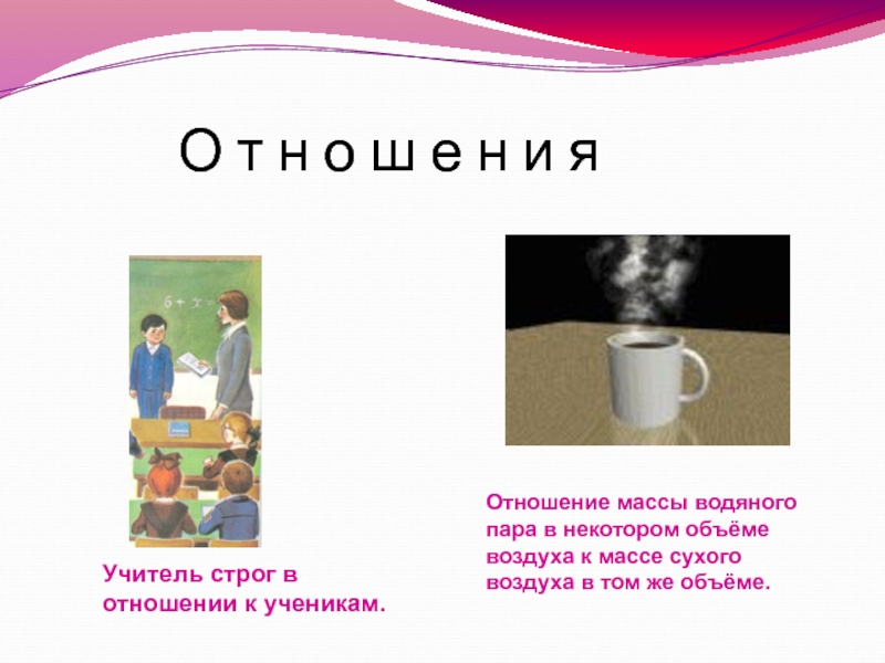О т н о ш е н и яУчитель строг в отношении к ученикам.Отношение массы водяного пара