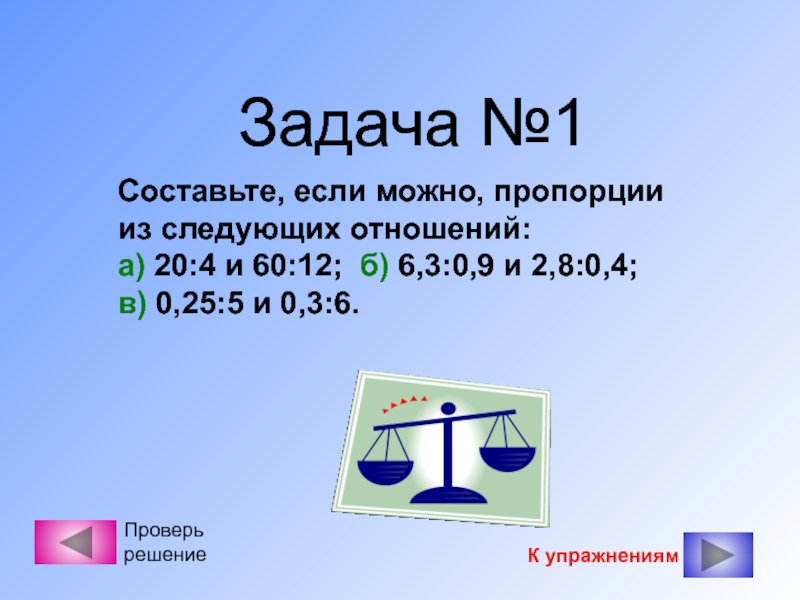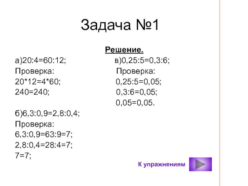 Задача №1Решение.а)20:4=60:12;           в)0,25:5=0,3:6;Проверка: