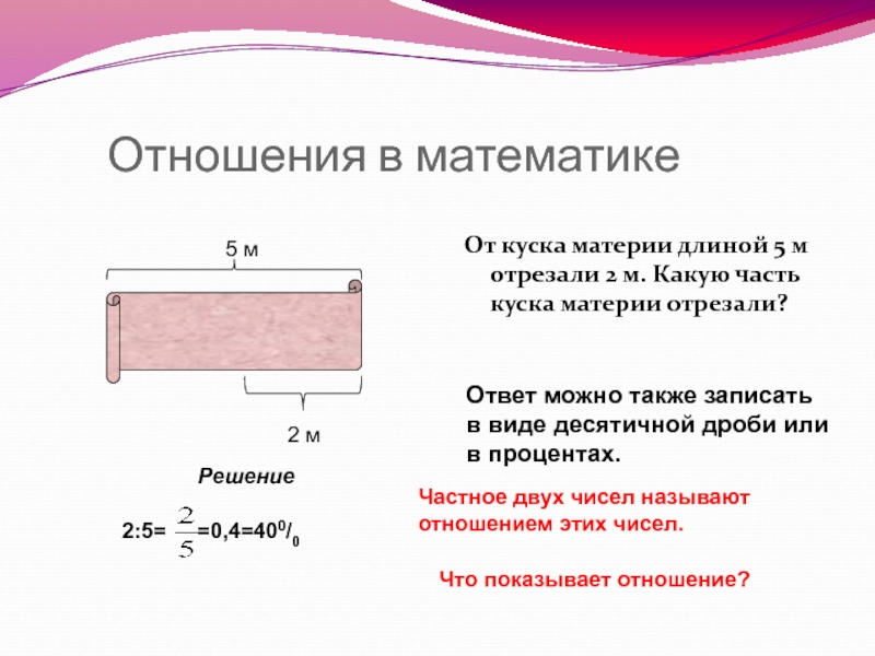 Отношения в математикеОт куска материи длиной 5 м отрезали 2 м. Какую часть куска материи отрезали?Решение=0,4=400/0Частное двух