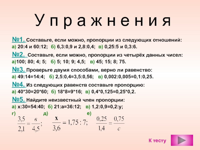 произведение крайних членов равно произведению средних членов пропорции, то пропорция верна.