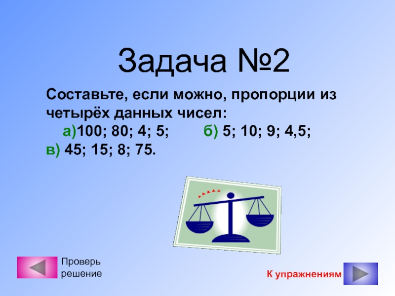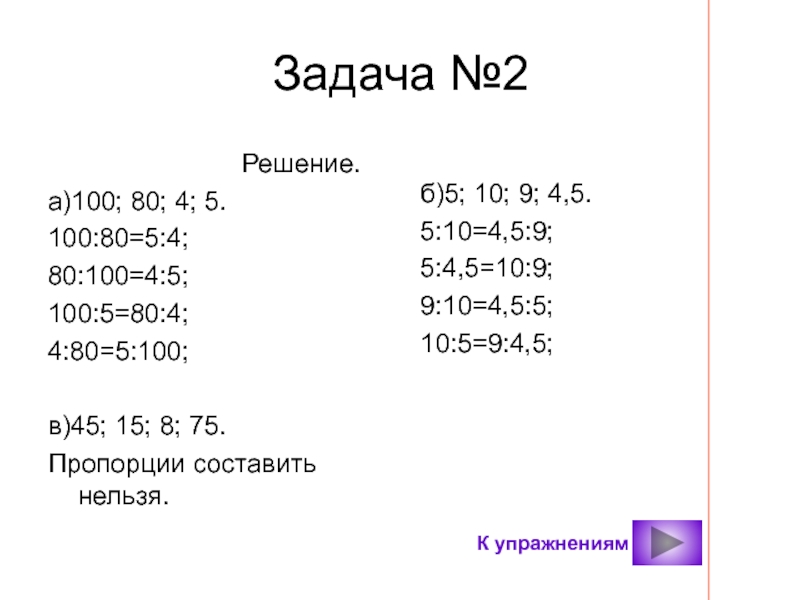 Задача №2Решение.а)100; 80; 4; 5.        100:80=5:4;80:100=4:5;100:5=80:4;4:80=5:100; в)45; 15; 8; 75.Пропорции