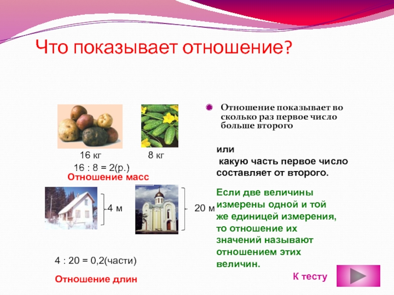 Что показывает отношение? Отношение показывает во сколько раз первое число больше второго   16 : 8