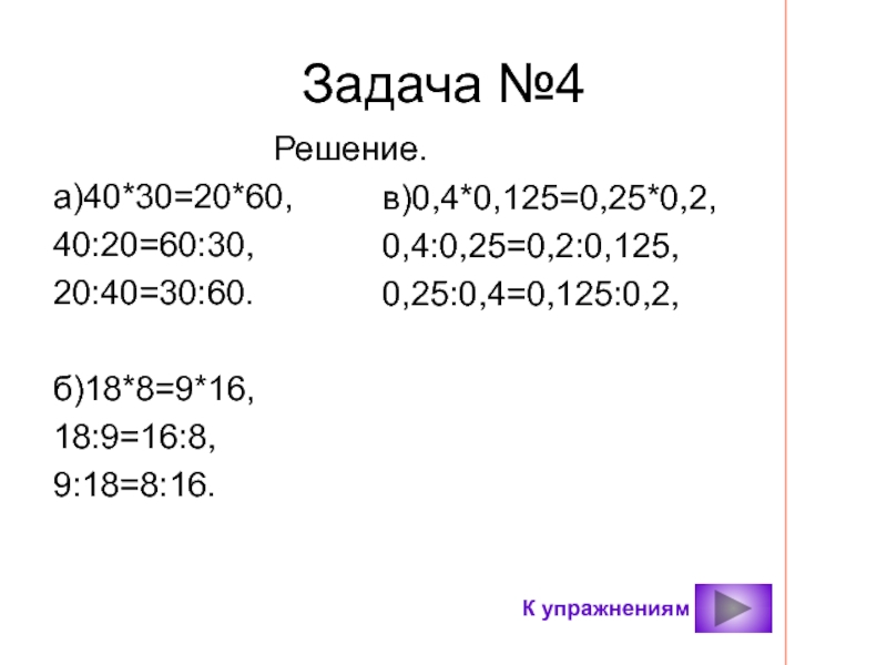Задача №4Решение.а)40*30=20*60,40:20=60:30,20:40=30:60.б)18*8=9*16,18:9=16:8,9:18=8:16.в)0,4*0,125=0,25*0,2,0,4:0,25=0,2:0,125,0,25:0,4=0,125:0,2,