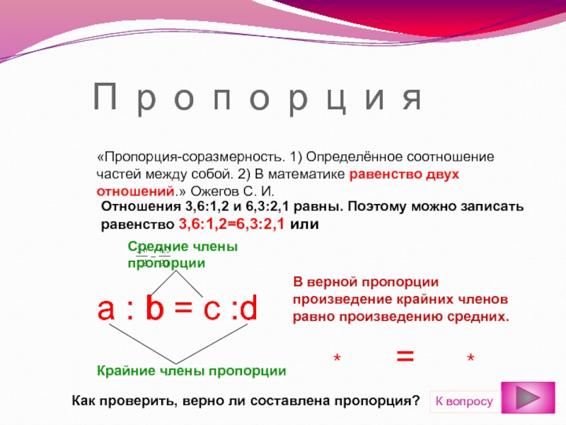 П р о п о р ц и я«Пропорция-соразмерность. 1) Определённое соотношение частей между собой. 2) В