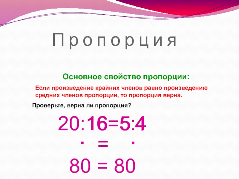 П р о п о р ц и яОсновное свойство пропорции:Если произведение крайних членов равно произведению средних