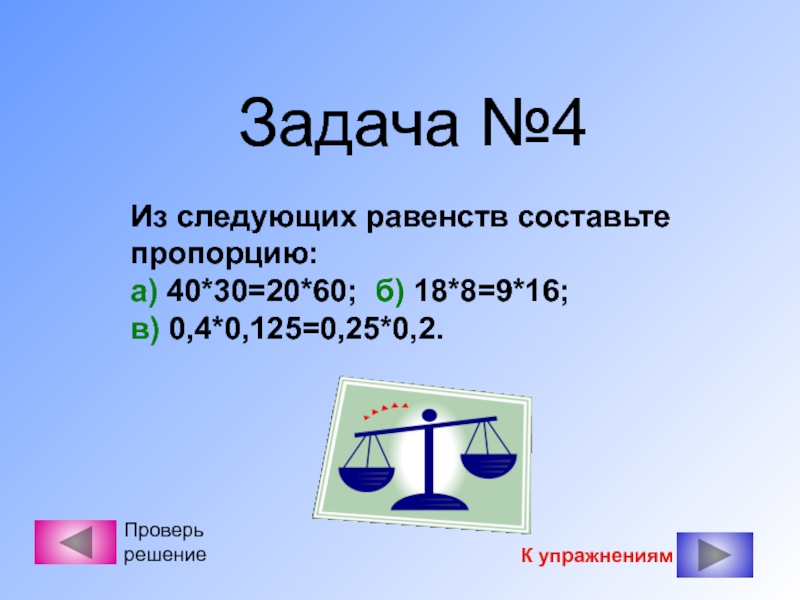 Задача №4Из следующих равенств составьте пропорцию:а) 40*30=20*60; б) 18*8=9*16;