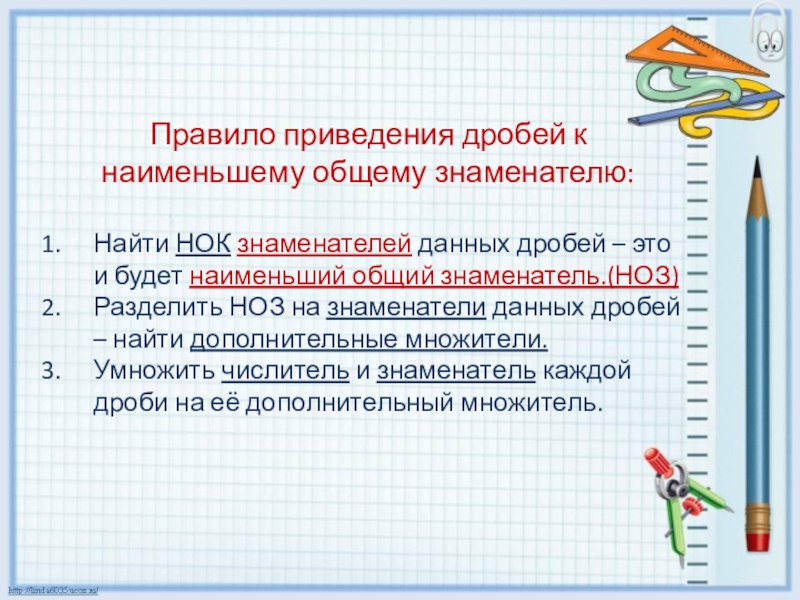 Правило приведения дробей к наименьшему общему знаменателю:Найти НОК знаменателей данных дробей – это и будет наименьший общий