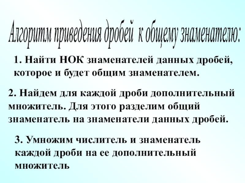 2. Найдем для каждой дроби дополнительный множитель. Для этого разделим общий знаменатель на знаменатели данных дробей.