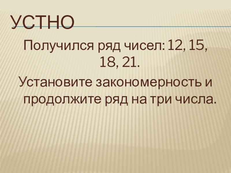 УстноПолучился ряд чисел: 12, 15, 18, 21.Установите закономерность и продолжите ряд на три числа.