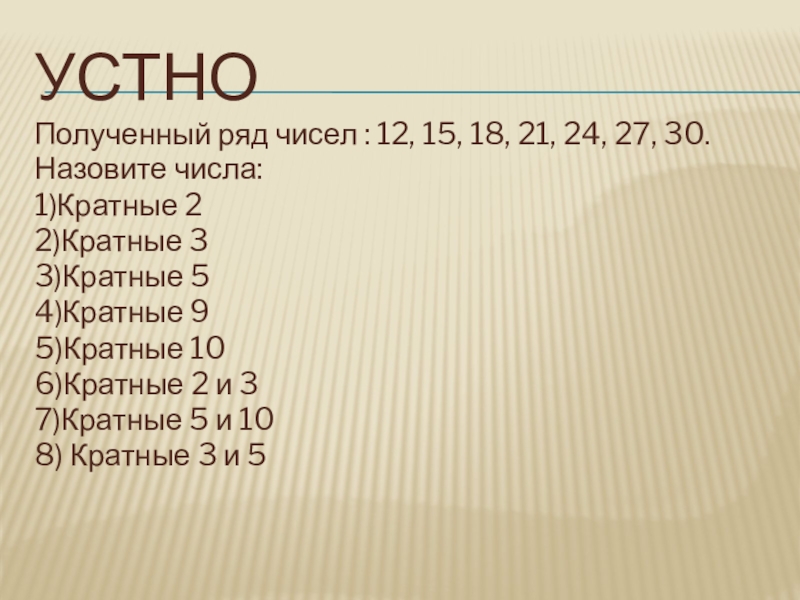устноПолученный ряд чисел : 12, 15, 18, 21, 24, 27, 30.Назовите числа: 1)Кратные 22)Кратные 33)Кратные 54)Кратные 95)Кратные
