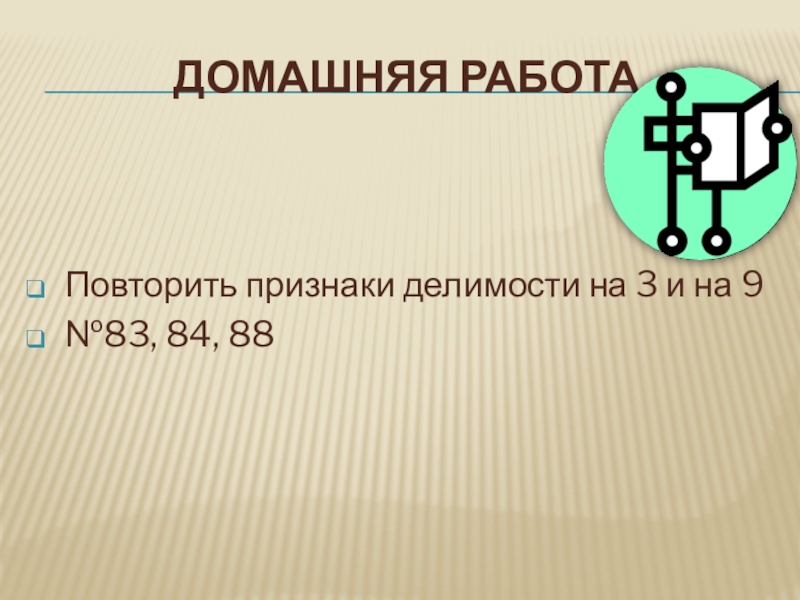 Домашняя работаПовторить признаки делимости на 3 и на 9№83, 84, 88