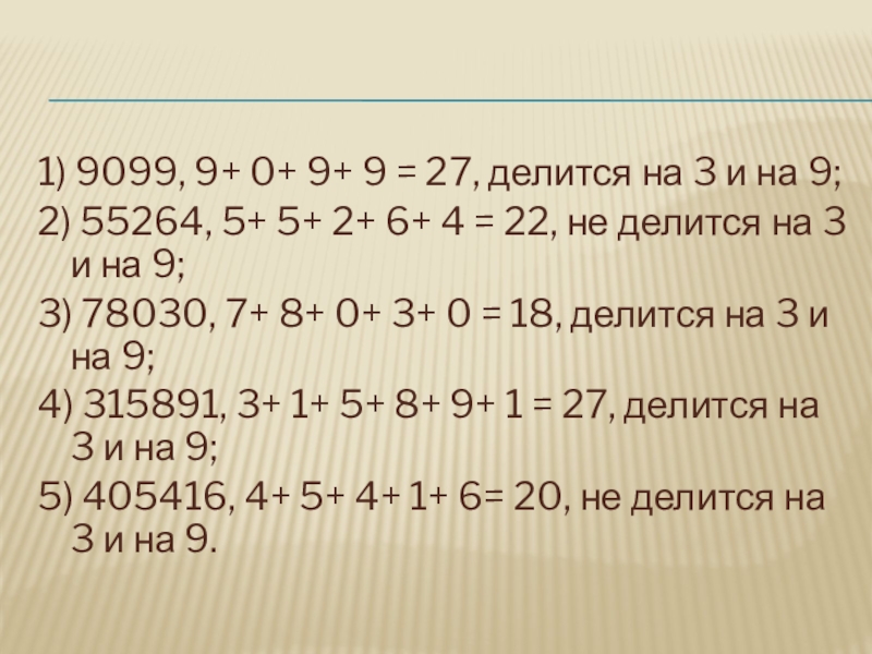Слайд 71) 9099, 9+ 0+ 9+ 9 = 27, делится на 3