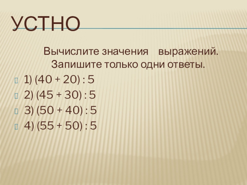 Устно	 Вычислите значения  выражений. Запишите только одни ответы. 1) (40 + 20) : 5 	2) (45