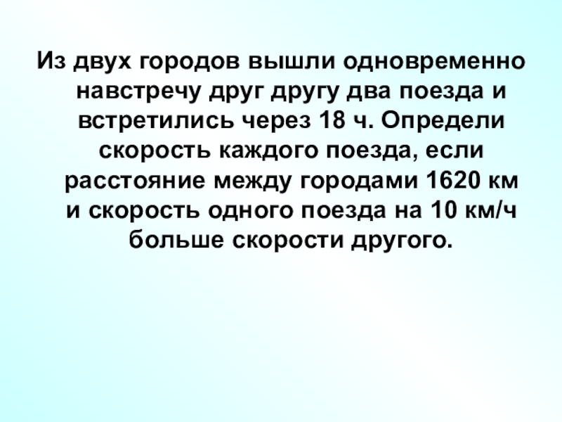 встретились через 18 ч. Определи скорость каждого поезда, если расстояние между городами 1620 км и скорость одного поезда на 10 км/ч больше скорости другого.