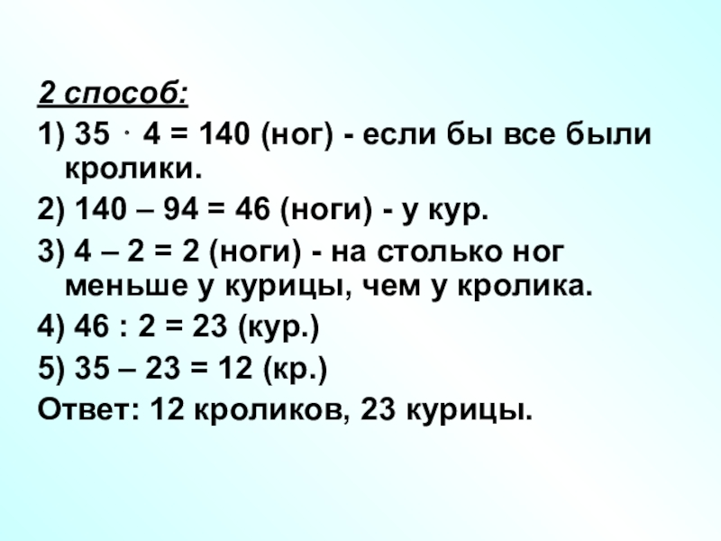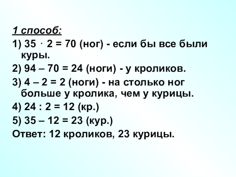 2) 94 – 70 = 24 (ноги) - у кроликов.
