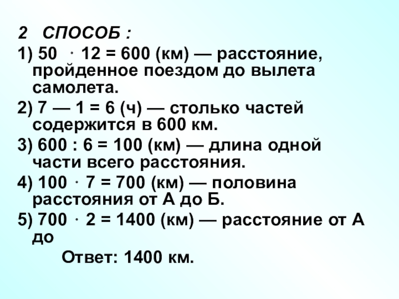 5) 350 ⋅ 2 = 700 (км) — половина расстояния от А до Б.