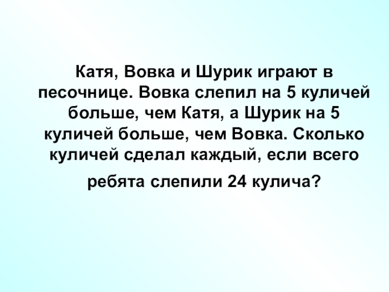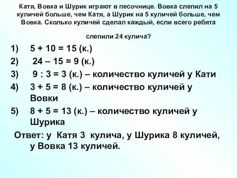 куличей больше, чем Катя, а Шурик на 5 куличей больше, чем Вовка. Сколько куличей сделал каждый, если всего ребята слепили 24 кулича?