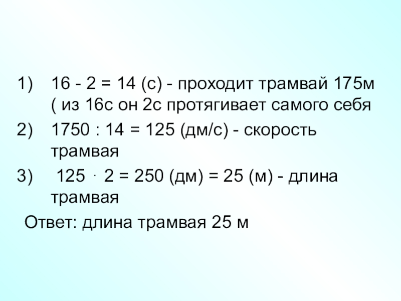 16 - 2 = 14 (с) - проходит трамвай 175м (