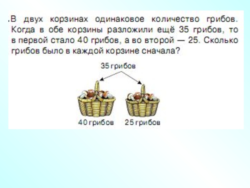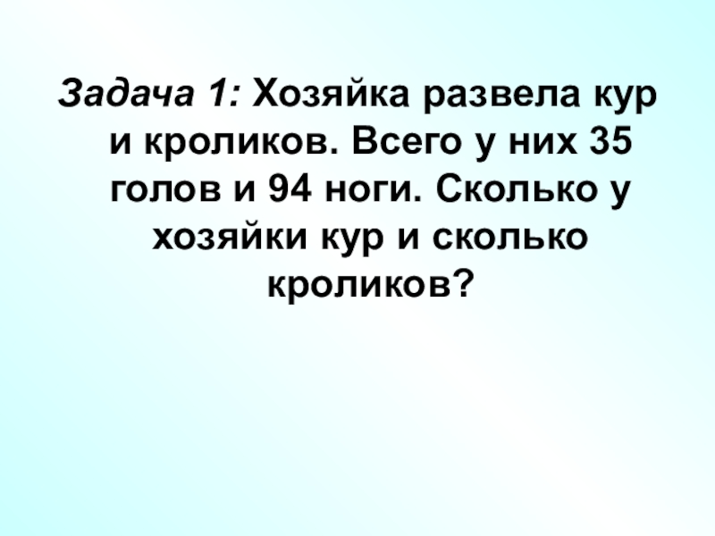 Слайд 20Задача 1: Хозяйка развела кур и кроликов. Всего у них 35