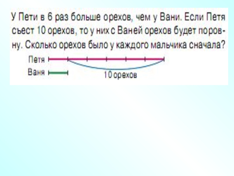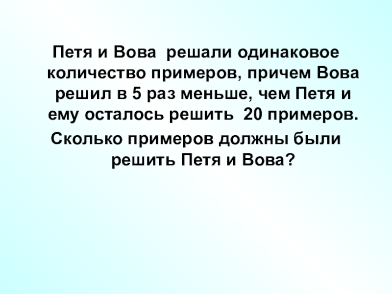 Слайд 16Петя и Вова решали одинаковое количество примеров, причем Вова решил в