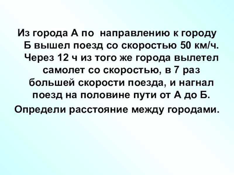 скоростью 50 км/ч. Через 12 ч из того же города вылетел самолет со скоростью, в 7 раз большей скорости поезда, и нагнал поезд на половине пути от А до Б.