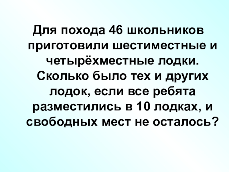 Слайд 23Для похода 46 школьников приготовили шестиместные и четырёхместные лодки. Сколько было
