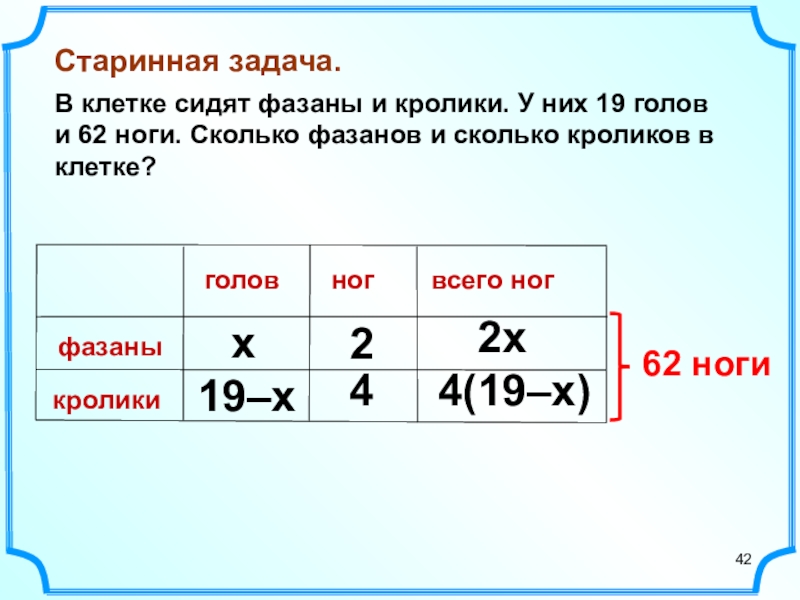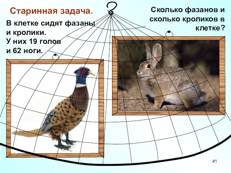 и 62 ноги. Сколько фазанов и сколько кроликов в клетке?