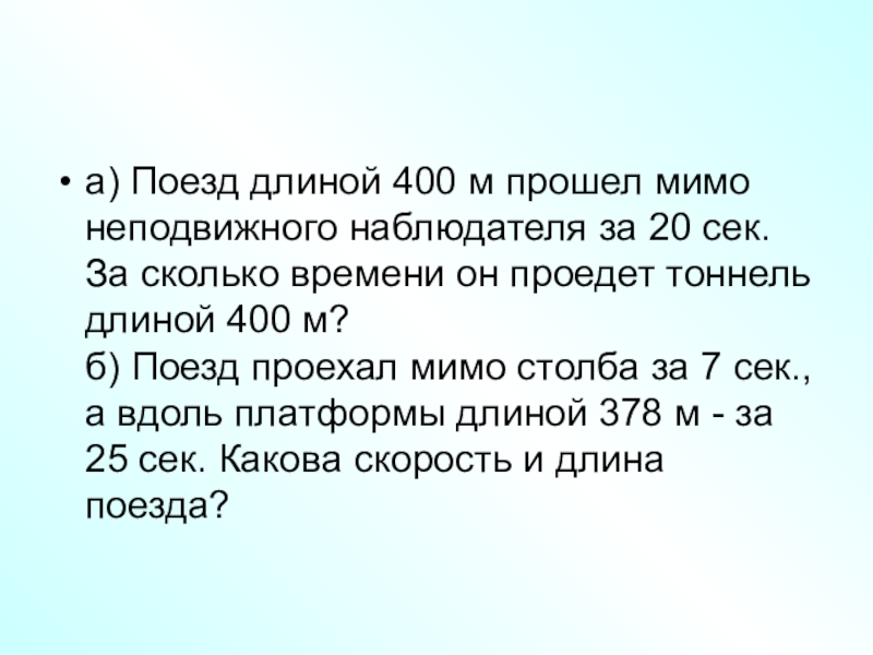 а) Поезд длиной 400 м прошел мимо неподвижного наблюдателя за 20