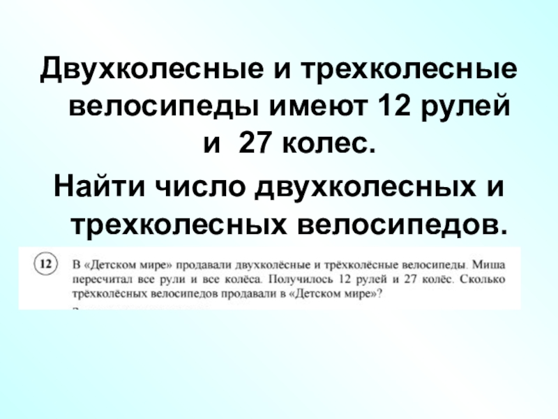 Слайд 25Двухколесные и трехколесные велосипеды имеют 12 рулей и 27 колес.