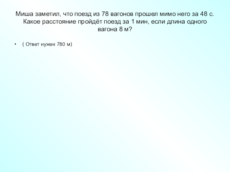Слайд 48Миша заметил, что поезд из 78 вагонов прошел мимо него за