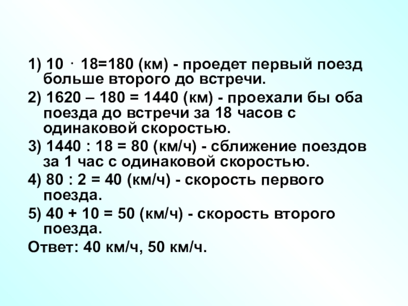 2) 1620 – 180 = 1440 (км) - проехали бы оба поезда до встречи за 18 часов с одинаковой скоростью.