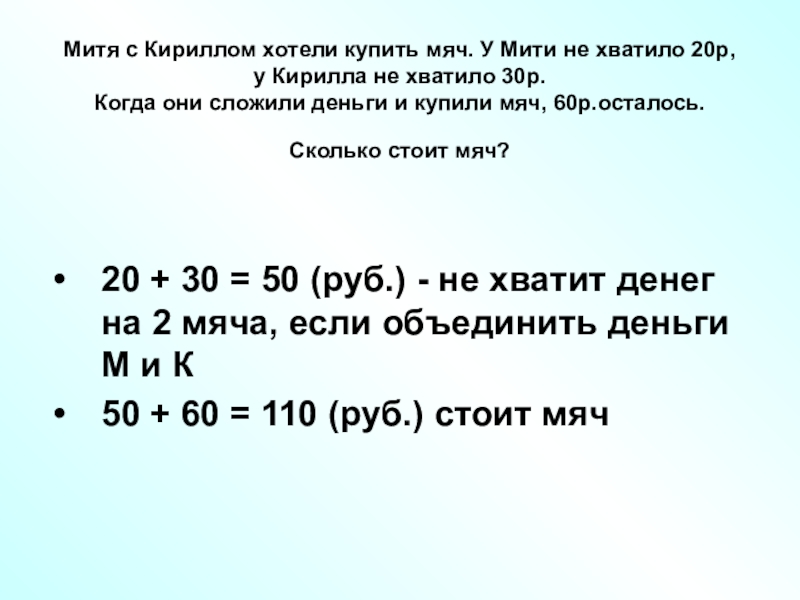 Слайд 18Митя с Кириллом хотели купить мяч. У Мити не хватило 20р,