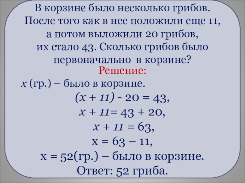 В корзине было несколько грибов. После того как в нее положили еще 11, а потом выложили 20 грибов,