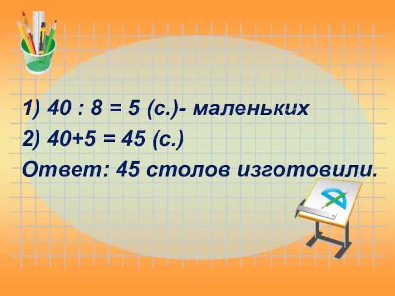 1) 40 : 8 = 5 (с.)- маленьких 2) 40+5 = 45 (с.)Ответ: 45 столов изготовили.