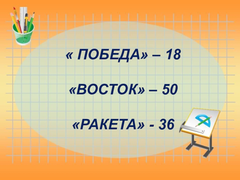 Слайд 12« ПОБЕДА» – 18 «ВОСТОК» – 50 «РАКЕТА» - 36