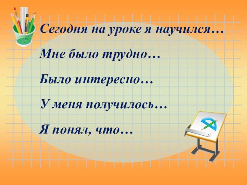 Сегодня на уроке я научился…Мне было трудно…Было интересно…У меня получилось…Я понял, что…