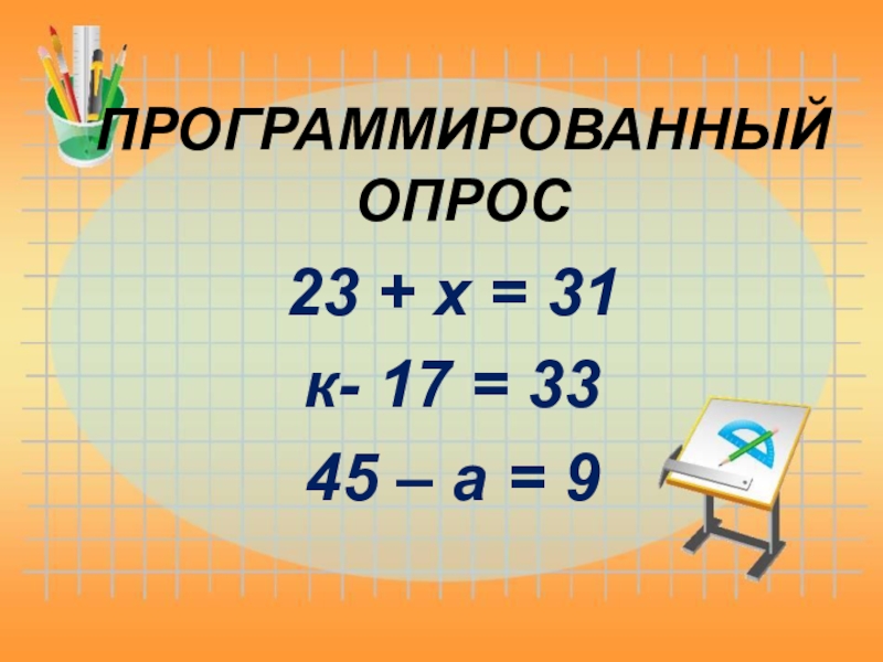 ПРОГРАММИРОВАННЫЙ ОПРОС 23 + х = 31 к- 17 = 3345 – а = 9