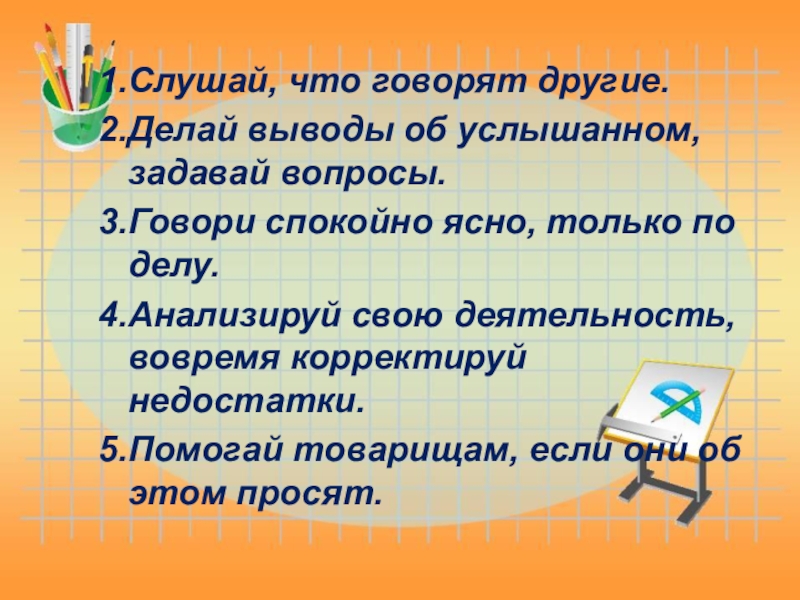 Слушай, что говорят другие.Делай выводы об услышанном, задавай вопросы.Говори спокойно ясно, только по делу.Анализируй свою деятельность, вовремя