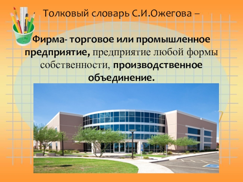 Слайд 3Толковый словарь С.И.Ожегова – Фирма- торговое или промышленное предприятие, предприятие любой