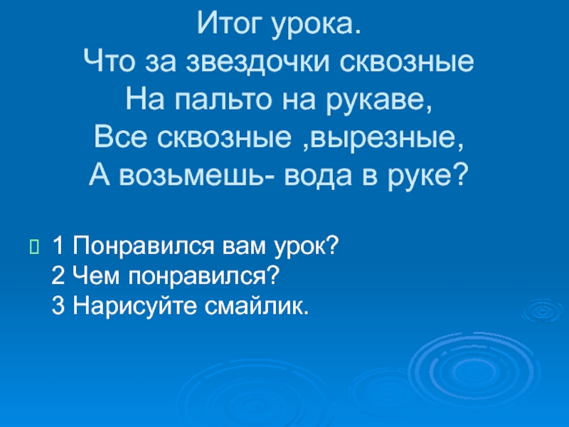 1 Понравился вам урок? 2 Чем понравился? 3 Нарисуйте смайлик.