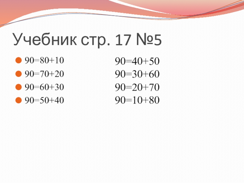 Учебник стр. 17 №590=80+1090=70+2090=60+3090=50+4090=40+5090=30+6090=20+7090=10+80