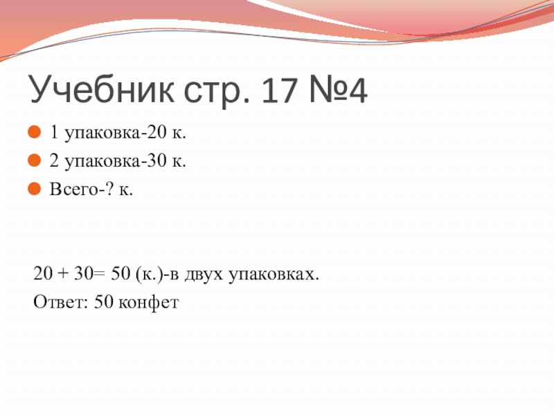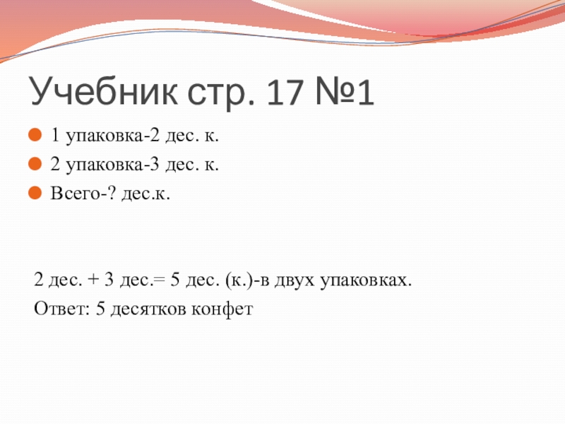 Учебник стр. 17 №11 упаковка-2 дес. к.2 упаковка-3 дес. к.Всего-? дес.к. 2 дес. + 3 дес.= 5