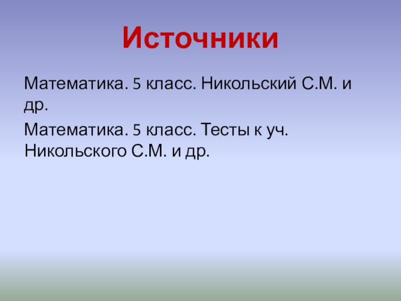ИсточникиМатематика. 5 класс. Никольский С.М. и др.Математика. 5 класс. Тесты к уч.Никольского С.М. и др.