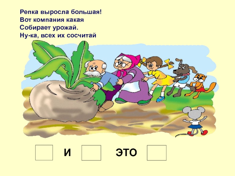 Слайд 4Репка выросла большая! Вот компания какая Собирает урожай. Ну-ка, всех их сосчитай