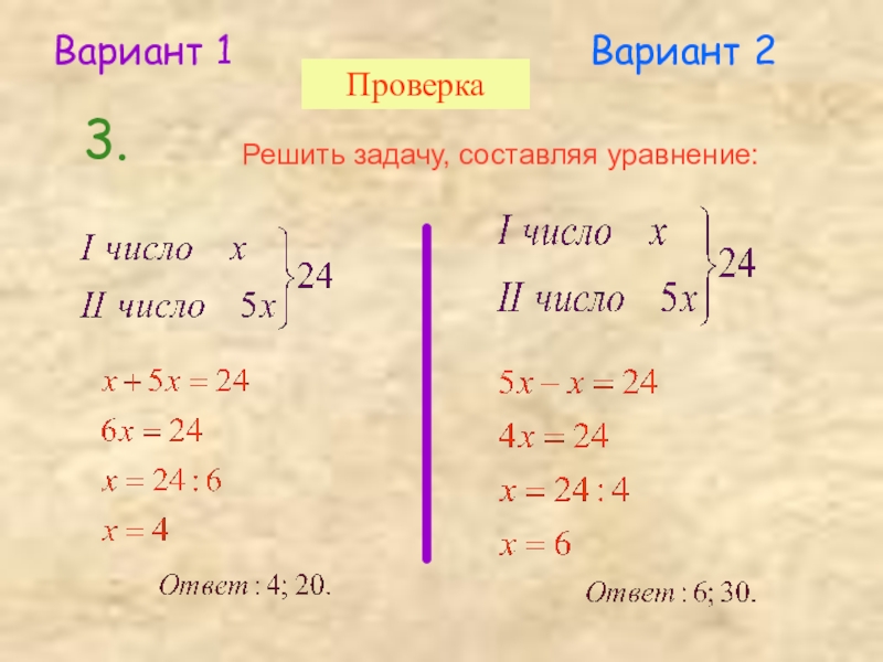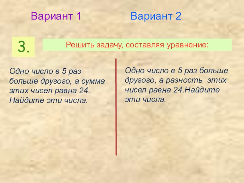 Одно число в 5 раз больше другого, а разность этих чисел равна 24.Найдите эти числа.