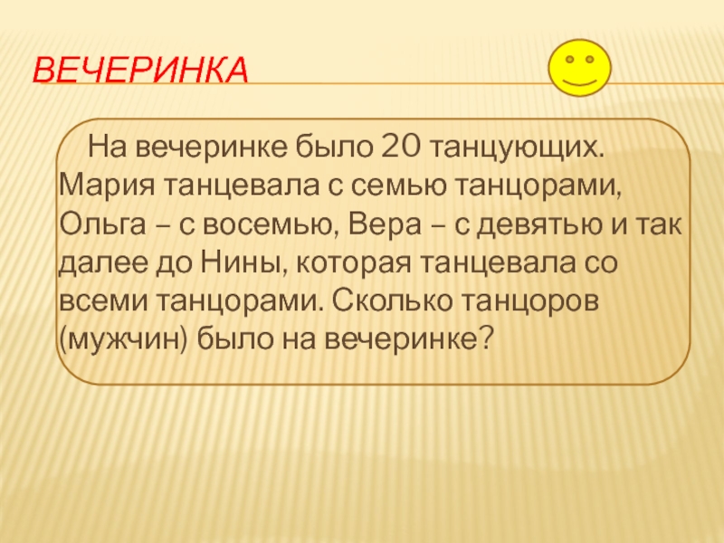 Мария танцевала с семью танцорами, Ольга – с восемью, Вера – с девятью и так далее до Нины, которая танцевала со всеми танцорами. Сколько танцоров (мужчин) было на вечеринке?