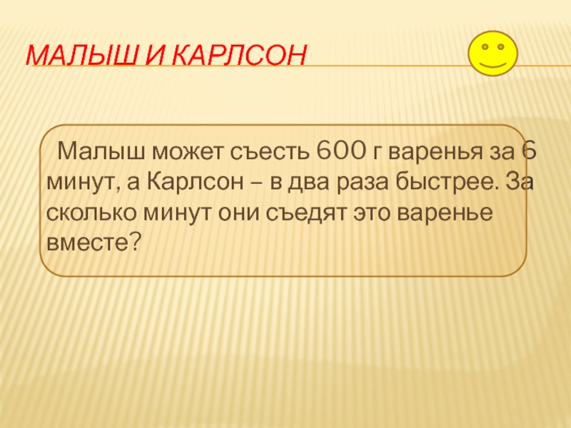 600 г варенья за 6 минут, а Карлсон – в два раза быстрее. За сколько минут они съедят это варенье вместе?