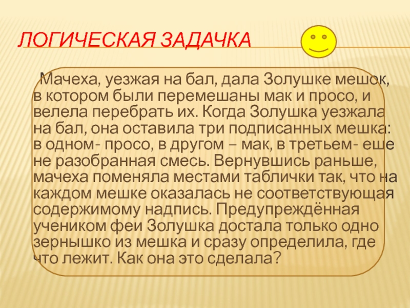 в котором были перемешаны мак и просо, и велела перебрать их. Когда Золушка уезжала на бал, она оставила три подписанных мешка: в одном- просо, в другом – мак, в третьем- еще не разобранная смесь. Вернувшись раньше, мачеха поменяла местами таблички так, что на каждом мешке оказалась не соответствующая содержимому надпись. Предупреждённая учеником феи Золушка достала только одно зернышко из мешка и сразу определила, где что лежит. Как она это сделала?